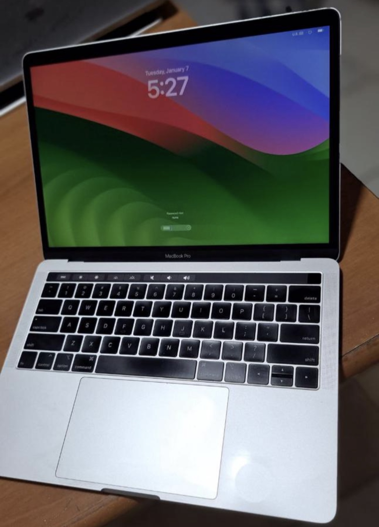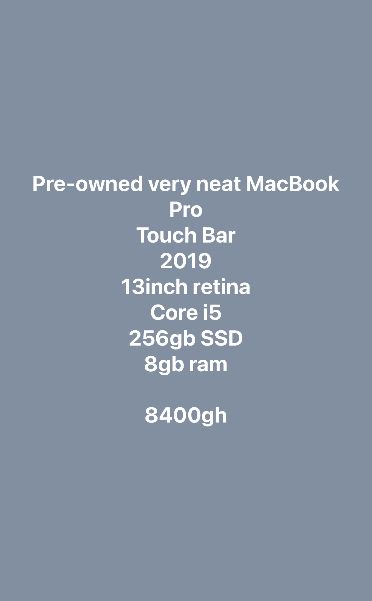 2019 pre owned very neat Mac book pro with Touch Bar, 13 inch retina, core i5, 8 gig ram and 256gig ssd